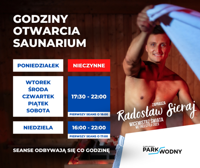 Saunarium to absolutnie wyjątkowe miejsce w Chełmskim Parku Wodnym. Jest to kompleks czterech saun – Biosauny, Sauny Ruskiej Bani, Sauny Fińskiej i Sauny Parowej.