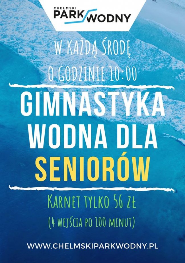 Zapraszamy serdecznie wszystkich Seniorów, ceniących dobry stan zdrowia oraz kondycję fizyczną na gimnastykę wodną w Chełmskim Parku Wodnym. Zajęcia odbywać się będą w każdą środę o godzinie 10:00 Widzimy się już 20 listopada
