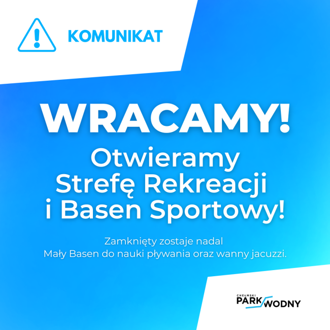 Mamy dobre wieści przed weekendem! Otwieramy ponownie Strefę Rekreacji i Basen Sportowy. Już od dzisiaj, od 13:00 zapraszamy! Jeszcze przez pewien czas zamknięty zostaje Mały Basen do nauki pływania oraz wanny jacuzzi.